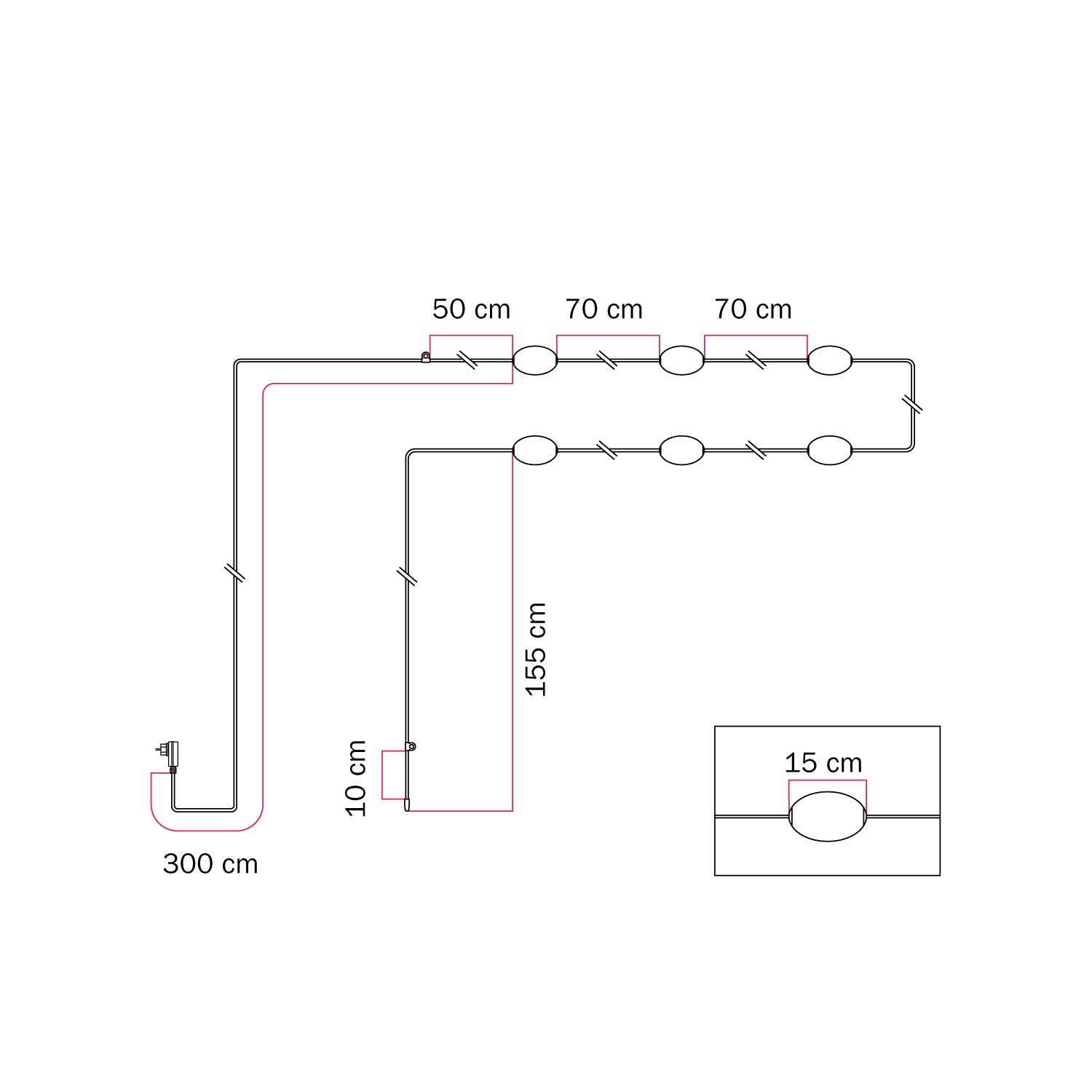 Zewnętrzny łańcuch świetlny IP67 składa się z: Kabel PVC o średnicy 6 mm – odporny na UV Zasilacz z wtyczką Schuko wejście 200/240V – 50/60Hz – wyjście 40V – 24W; IP44 Klosze i abażury z LLDPE z powłoką odporną na promieniowanie UV, szerokość 105 mm, średnica 15 mm